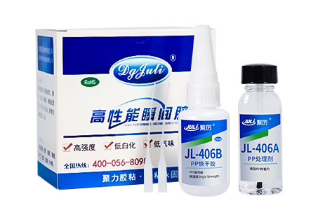 聚厲牌JL-406PP專用瞬間膠符合環保標準,通過歐盟ROHS標準和SGS檢測,對一些特殊材質,獨立研發生產的特種瞬間膠粘劑,雙組分,施工便利,非常適合連續化生產線作業;具有高性能、高強度、柔韌性好、耐濕性等性能。