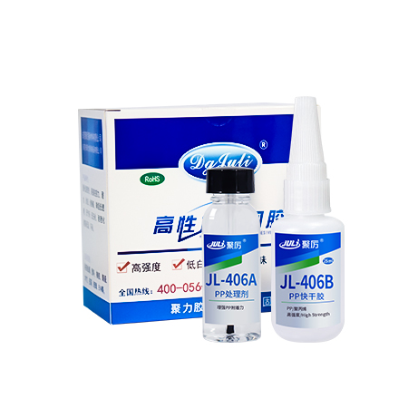聚厲牌JL-406AB PP專用瞬間膠水:A劑是PP處理劑。B劑是PP粘接劑,AB配和使用效果更好,廣泛適用于PP、PE/POM、PVC、ABS、PC、橡膠、硅膠、陶瓷、金屬、木材、EVA、PPS、皮革等塑料材料的粘合效果佳。